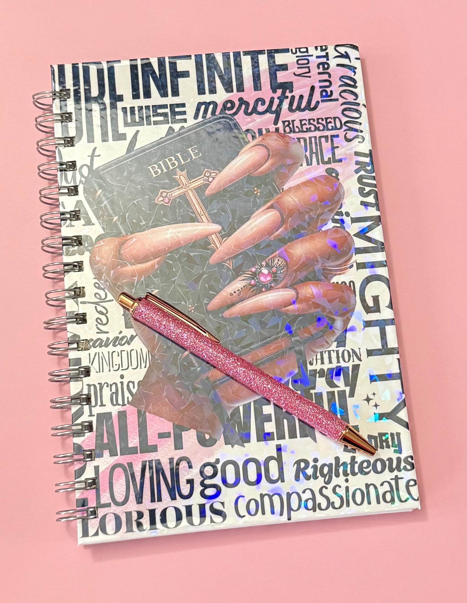 Write with purpose and faith ✨ This spiral-bound notebook is more than just a place for notes—it’s a daily reminder of strength, grace, and inspiration. The cover features a striking design with a hand holding a Bible, surrounded by empowering affirmations like “merciful, gracious, righteous, loving, infinite.” Inside, lined pages with a subtle cross and Bible illustration keep your journaling, prayers, or daily notes centered on positivity.